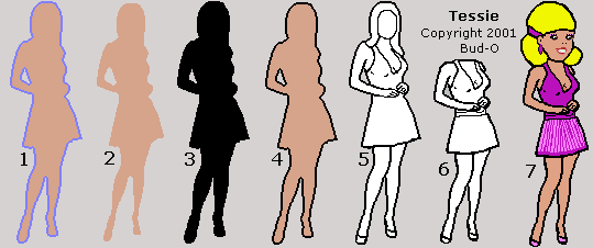 Using the magic wand tool, hold down the shift key and select all the white background areas. If you see some small scattered halos in the background area, that means you have stray pixels that are not perfectly white, and they must be removed. You can use the rectangle or lasso selection tool to select a stray then click the Cut button. You may have to select with halo tool several times to see and remove all the strays. After removing the strays, select all the white with magic wand tool, click Selections, Invert. Click Selections, Modify, Contract, 2 pixels. Click Copy. Open a new image same size and Paste selection. Save As Image 2.bmp. Open Image1.bmp, select white background areas with magic wand. Click Selections, Invert. Click Image, Effects, Cutout. Set the cutout screen as follows...Fill interior with black, Opacity 100, Blur 0, Horizontal and Vertical Offset 0. Click OK. Save As Image3.bmp. Open Image2.bmp and select white background areas with the magic wand. Click Selections, Invert. Copy to clipboard. Open Image3.bmp and Paste, being careful to center subject with a 2 pixel border around it. Save As Image4.bmp. With Image4.bmp open click Colors, Channel Splitting, Split RGB. Three new images will appear. Normally you can close without saving the blue and green, save the red as Image5.bmp. At this point you can fill in some missing detail lines such as the clothing, arms, hands, shoes, etc by carefully tracing over the subject with black. Then save. With Image5.bmp open, click Colors, Adjust, Brightness, adjust to about +40, until most of the gray is gone. Click OK. Click Colors, Decrease Color Depth, 1 bit, Save. Do not attempt the next step with an image higher than true monochromatic black and white or you will have a huge mess. Depending on the size of the head used, the 1 bit image needs to be reduced. The body should be about 165 pixels from toe to shoulder. Resize accordingly using Smart Size, click CtrlA, click Copy, open a new image 154 X 224, paste and Save As Image6.bmp A few wild pixels will show up which can be easily fixed. For drawing the head and adding other features, keep image at 1 bit. As you work through your poses, keep them all at 1 bit until finished. It's much easier to resize, rotate, copy and paste with monochromatic as you aren't constantly fighting the dithering and blurring. All this seems complicated, but the entire process from Image1 to Image6 only takes about 10 minutes once you get the hang of it. Several steps listed may be redundant, but repetition will help you learn. As you progress, you will see shortcuts such as keeping more images open at one time. When you are ready to add color, increase the color depth back to 24 bit. Forget all the dithering, shading, smoothing, smudging or other blending in the final poses, that just makes the file size bigger. There should be no more than 16 colors in the final pose. To check this click Colors, Count Colors. If there are 17 or more colors, then click Colors, Decrease Color Depth, 16 colors (4 bit), Optimized Octree, Nearest Color. This will force the colors to the standard 16 palette. Then increase the color depth back to 24 bit so you can make special colors such as flesh tones. Once all the poses are finished, download SAMPLE AVS FILE . After extracting sample.avs from the ZIP file, open it into the MS Chat Character Editor, then 'save as' newname.avs and import your 24 bit poses. Set the head targets, add the character icon, and fill out the properties section. When making the avb, set to high color. The colors stay sharp and the file sizes are small. If the avb file size exceeds 100kb, you're using too many colors or a lot of shading and dithering. The clothing, colors, face, hair style, etc should be consistent especially among the neutrals and standard emoticon poses such as Laugh1, wave, point other and point self. After all, if you are speaking to someone in person, they aren't constantly changing colors or costumes. Save the special, surprise stuff for the send emotion feature of the emotion wheel. If your pose colors are all different, the file size will grow, and the character will be confusing to others. Don't try to cram all your ideas into one huge character, better to make several. For more info on sequencing poses refer to the FAQ on this site. To help you follow this guide while working, copy and paste this page to a .txt file and print it out.
